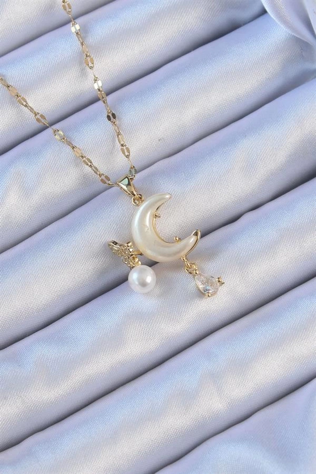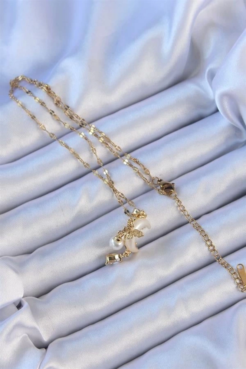 316L Çelik Zincir Altın Renk Zirkon Taşlı Kelebekli Mineli Ay Kolye