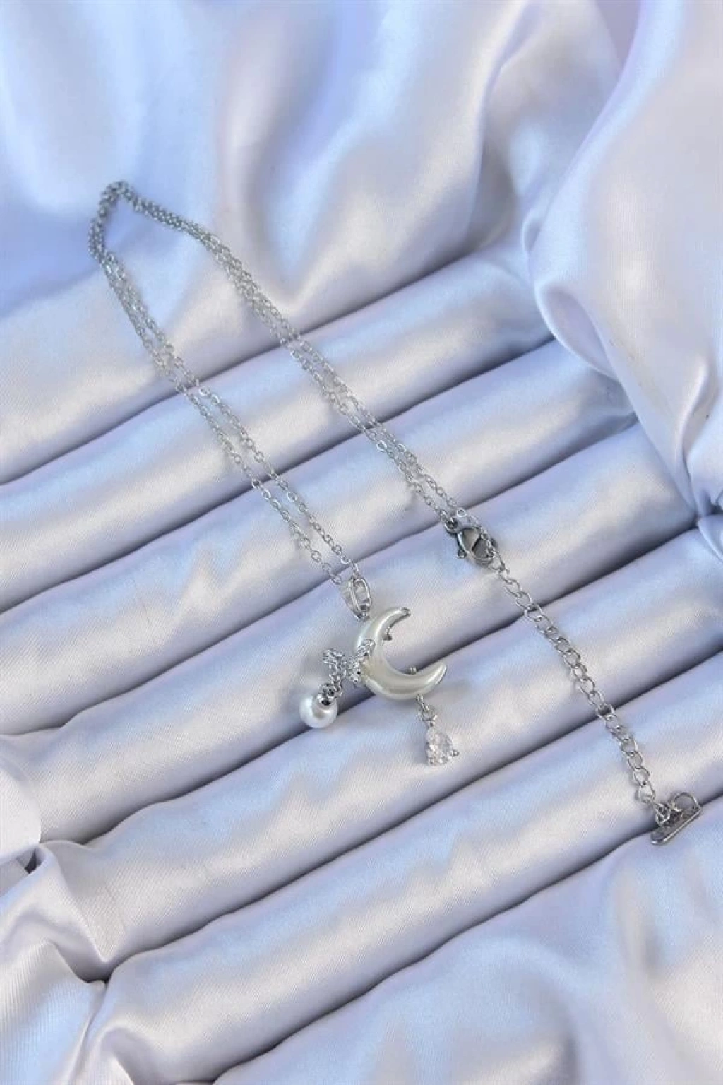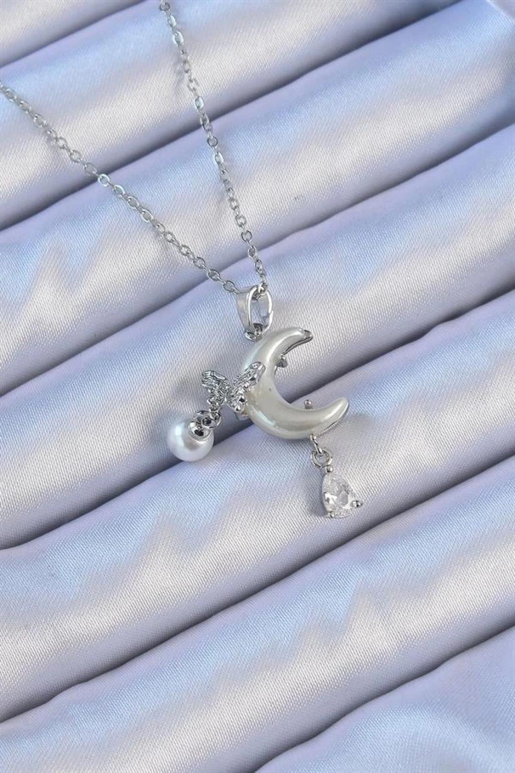 316L Çelik Zincir Gümüş Renk Zirkon Taşlı Kelebekli Mineli Ay Kolye